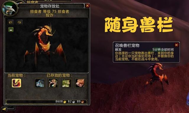 4,猎人的兽栏变成了四个,加上随身携带的宠物,一共可以保留5个宠物。同时猎人也获得了一个名为"召唤宠物栏"的技能,在任何时候都可以直接更换携带的宠物。