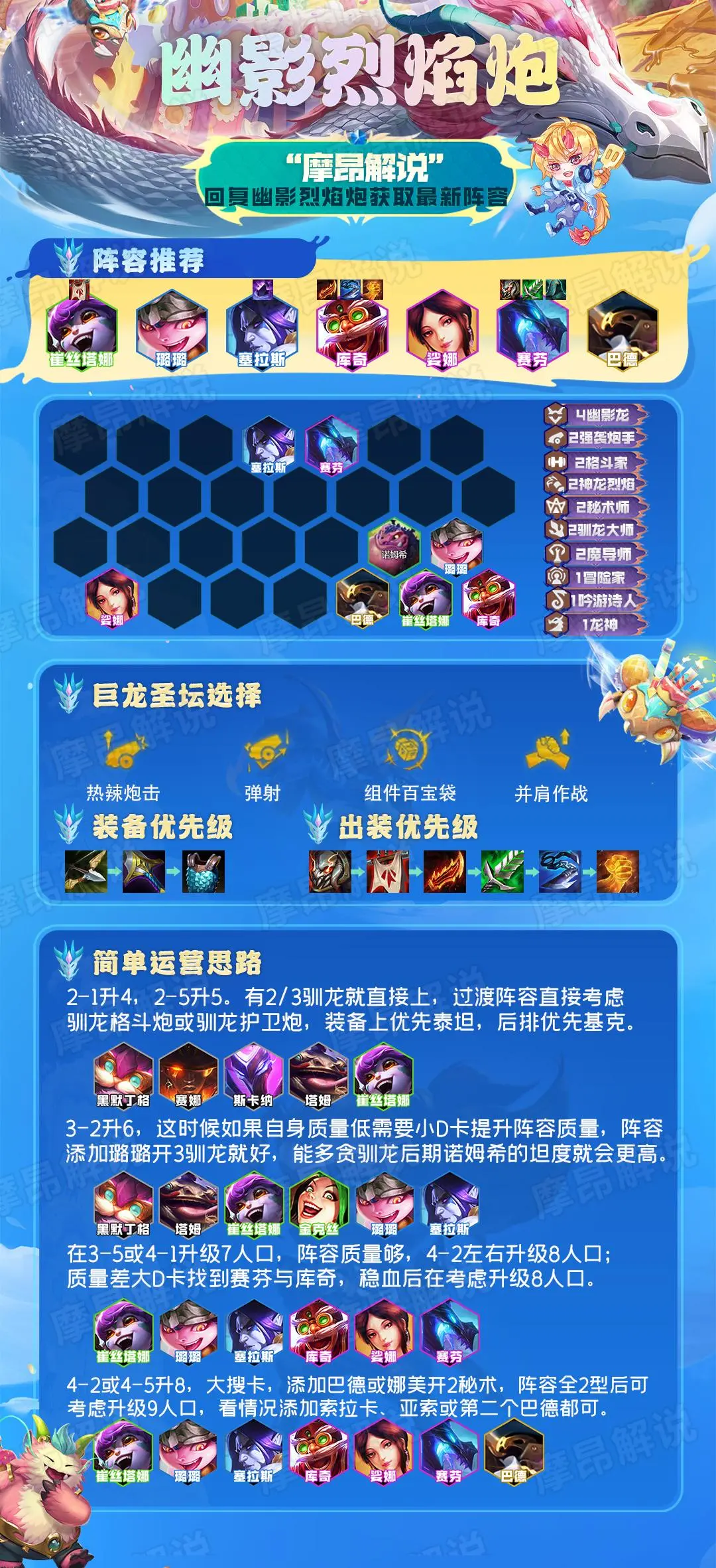 龙训系统这个版本是小切。从阵容上限来看,驯龙风暴依然是实力最高的阵容。奥星小在这个版本中把一星的技能伤害加强到了225,一星锁血的强度略有增加。不过这个阵容娜美,塞拉斯,还有训练二龙的诺姆奇都被砍了,耐力和谭度都略有下降。他们甚至吃了晒度装备。现在的版本仍然需要两位明星才能进入决赛,仍然没有之前强势版本的强大统治力。我们必须注意这一点。