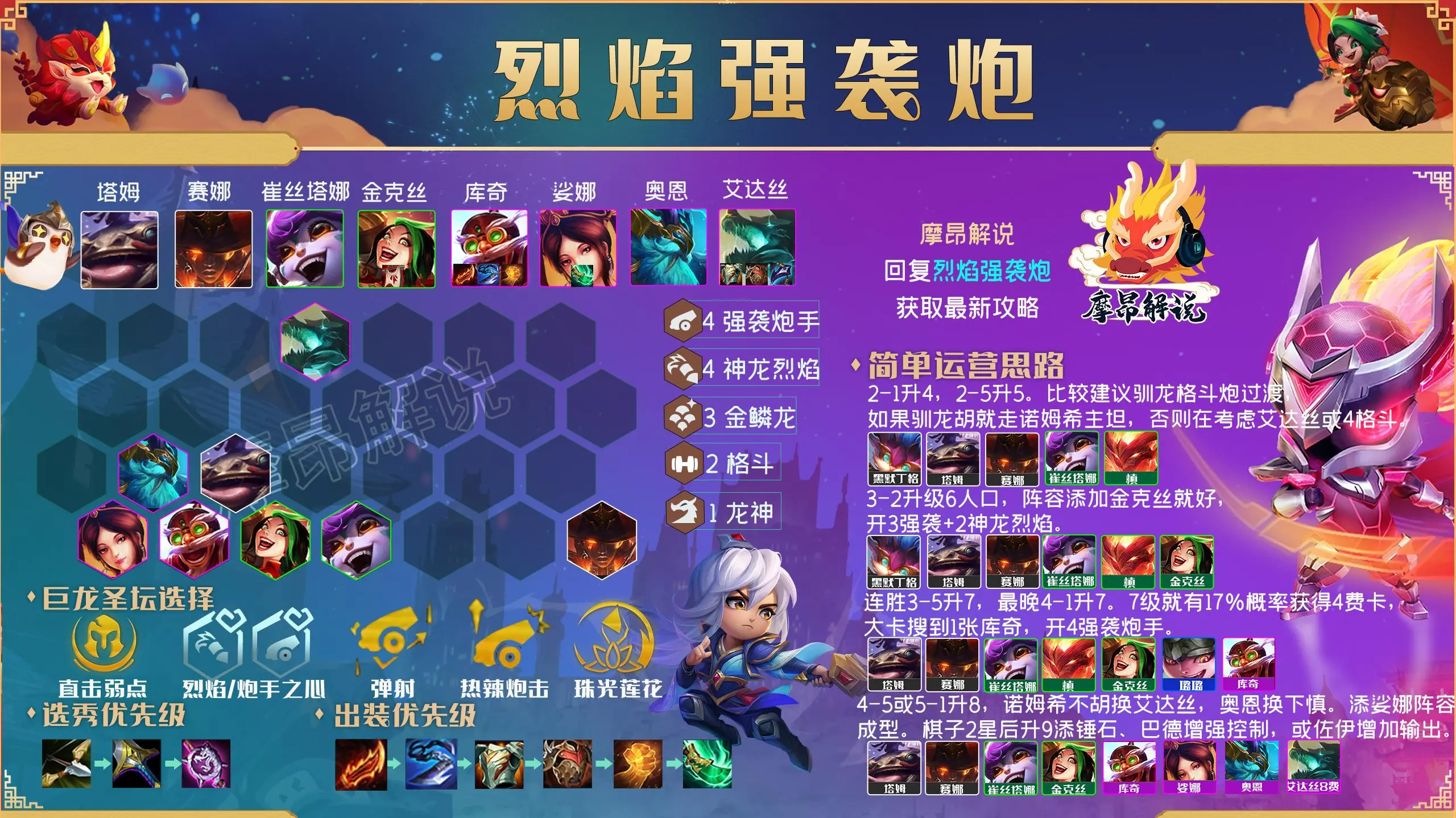 这里,莫昂再一次聚焦。很多兄弟说不能得分,但是请自己找出原因。赛后回来看看自己哪里做错了,打的是不是阵容强大,前期血量是否稳定,装备是否躺在准备垫上,后期的调校是否有问题。