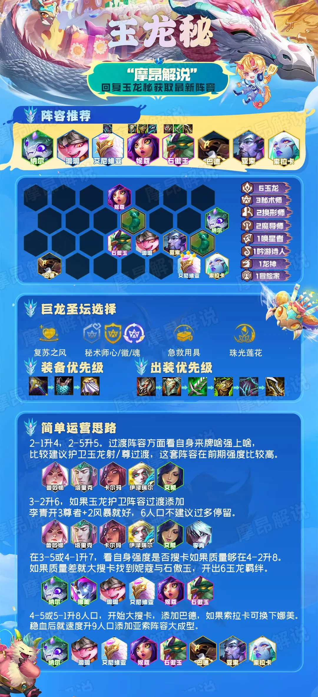 本版石傲宇技能攻击力增益小砍,现在只有2星的275%,输出能力下降很大。不过玉龙系是本季常青树阵容。无论是宇龙秘笈还是9宇龙的实力,在测试中依然能稳定得分,而且现在同行少了,更容易形成。但是,这个系统的这个版本很难吃鸡。今天在宇龙系统的测试中,只有9个宇龙2星索拉卡吃了一局,其他时候只能吃鸡屁股。