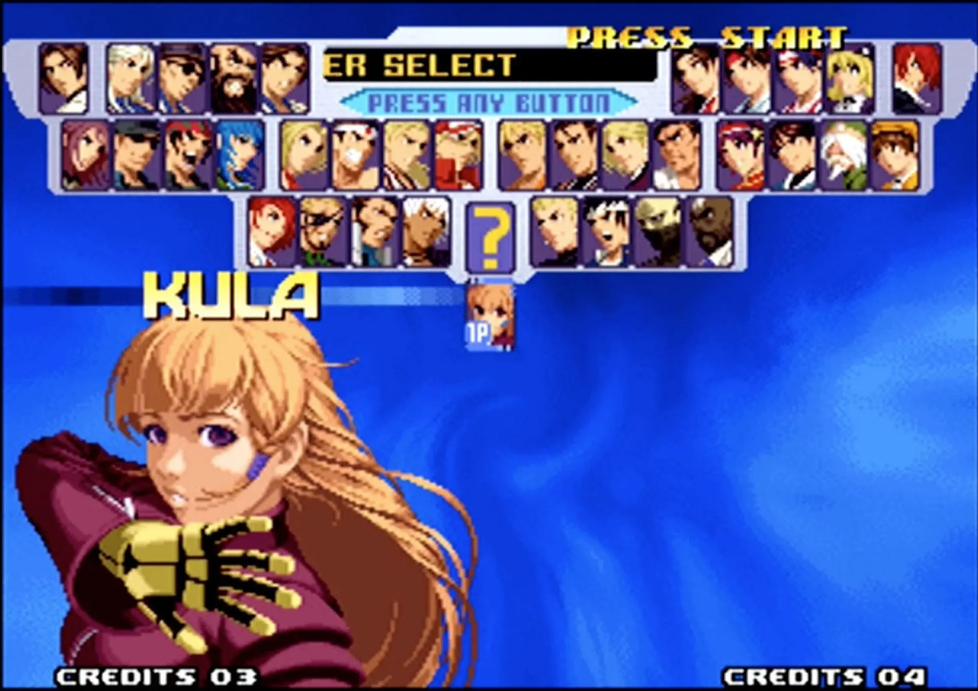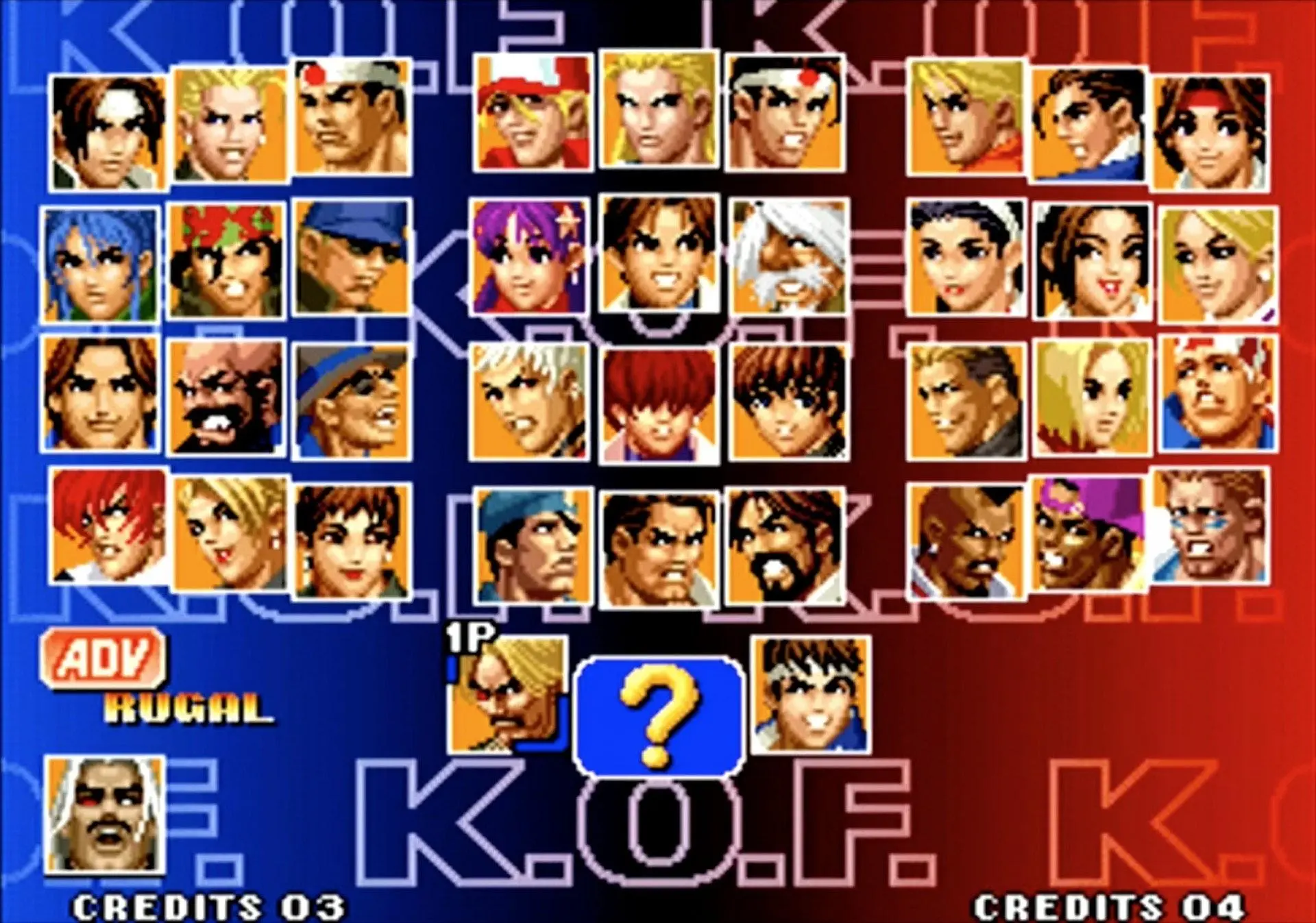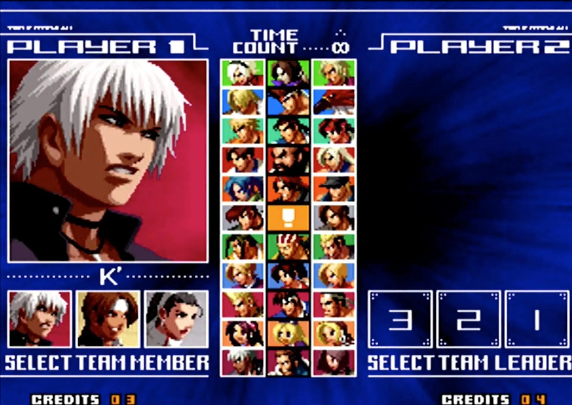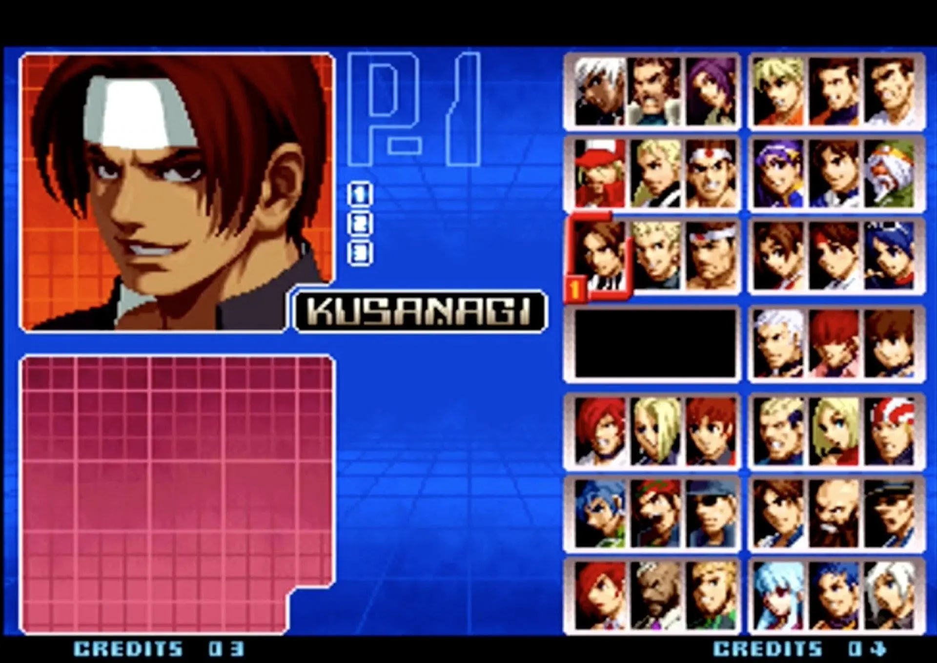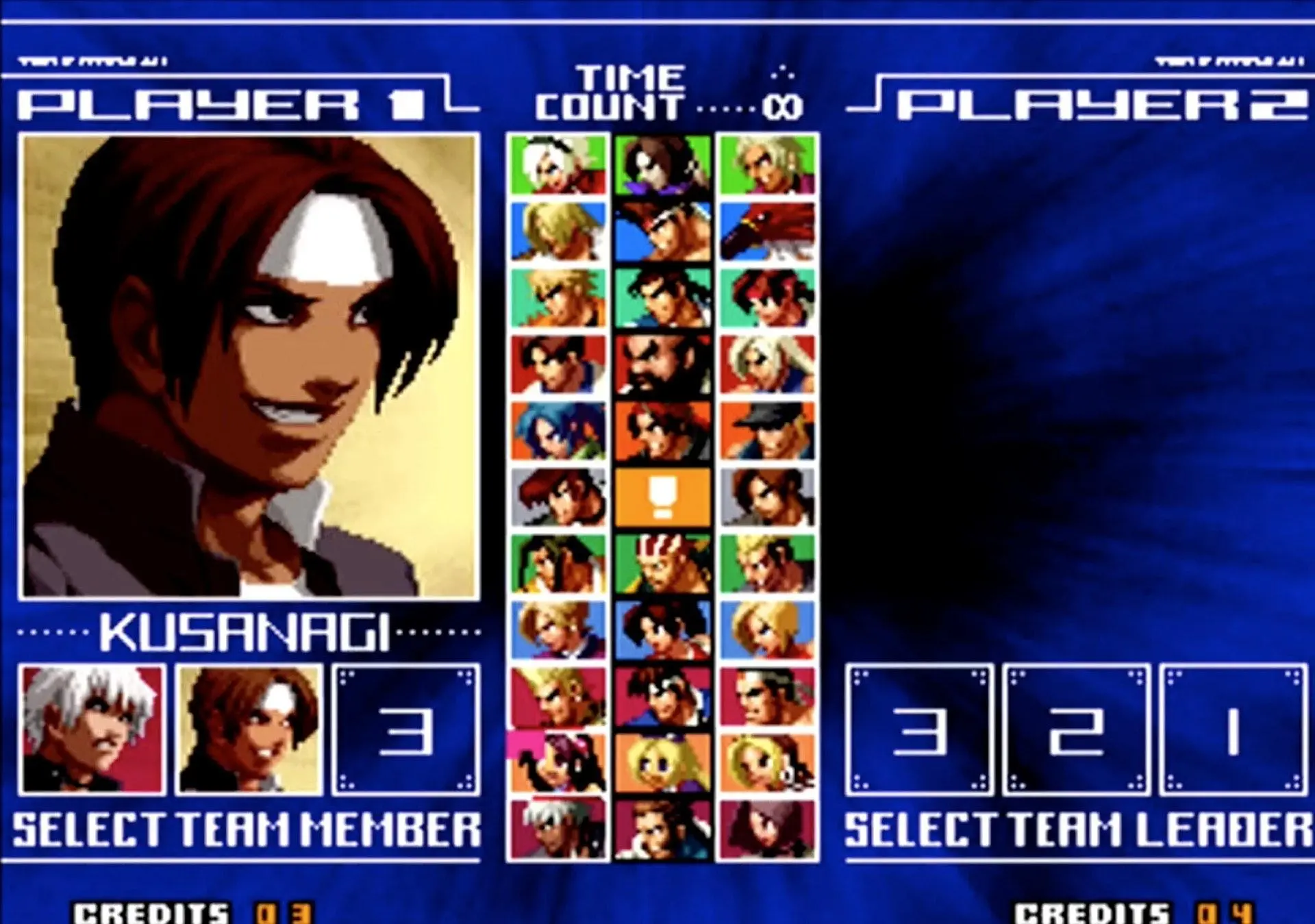 拳皇 KOF 2002(大蛇队):大蛇队则更简单,只需要在相应角色上按着Start选人便可。