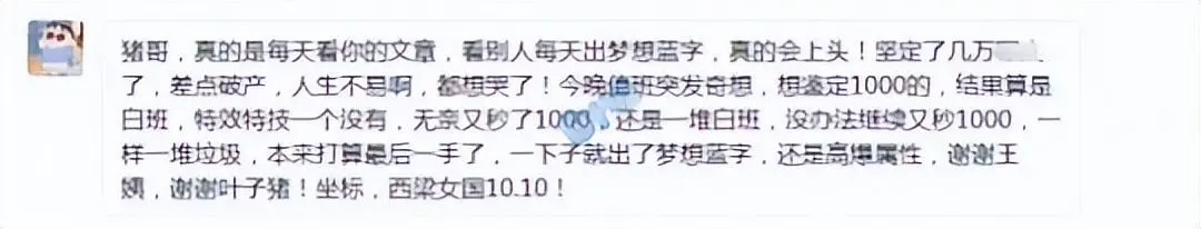 粉丝还分享了内心的鉴定独白。他是因为关注我们后踏上了鉴定装备之旅,起初上头亏了几万,都快哭了。在今天值班时,突发奇想再去挑战,前面3000鉴定了一堆白板,在最后一手才逆袭。感谢完叶子猪和网易,还把追梦坐标分享出来。最后打个广告,对飘带有想法的老板可到江苏2区【姑苏城】,联系ID43464945详聊。
