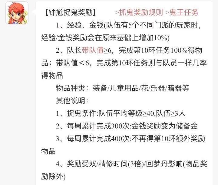或许这句话是朋友们在聊天中提及最多的一句话了。下图是梦幻精灵的回答,我相信一个游戏的初衷是让你体验到更多的玩法和乐趣,但是梦幻的经济体系在摆着,导致很多人把他当作一个赚钱的工具,所以才会有下图的抓鬼限制。当你每周抓到300个以后奖励就开始下降了,从抓鬼来看,梦幻确实有这个机制,你如果重复做一件事情,奖励会变差,抓鬼一样,副本夜叉等等都一样,都有这个机制。