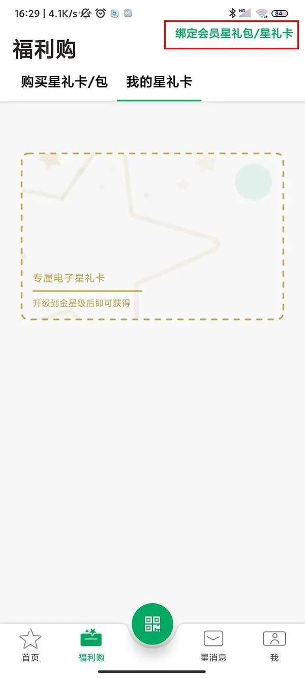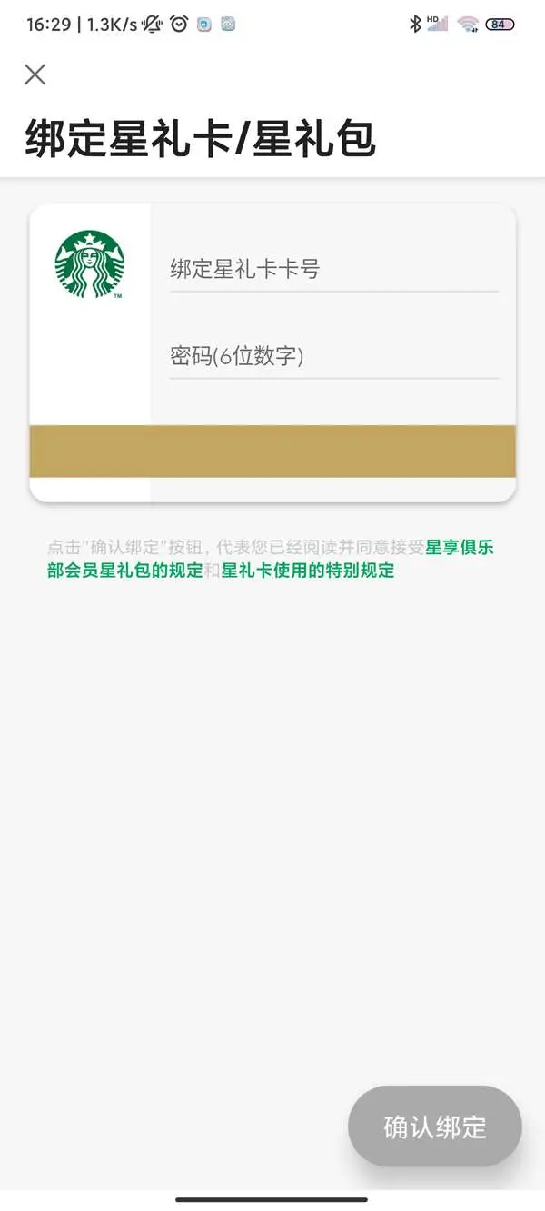 1.在星巴克福利购买页面,点击我的明星礼品卡,点击绑定明星礼品卡,输入明星礼品卡信息。