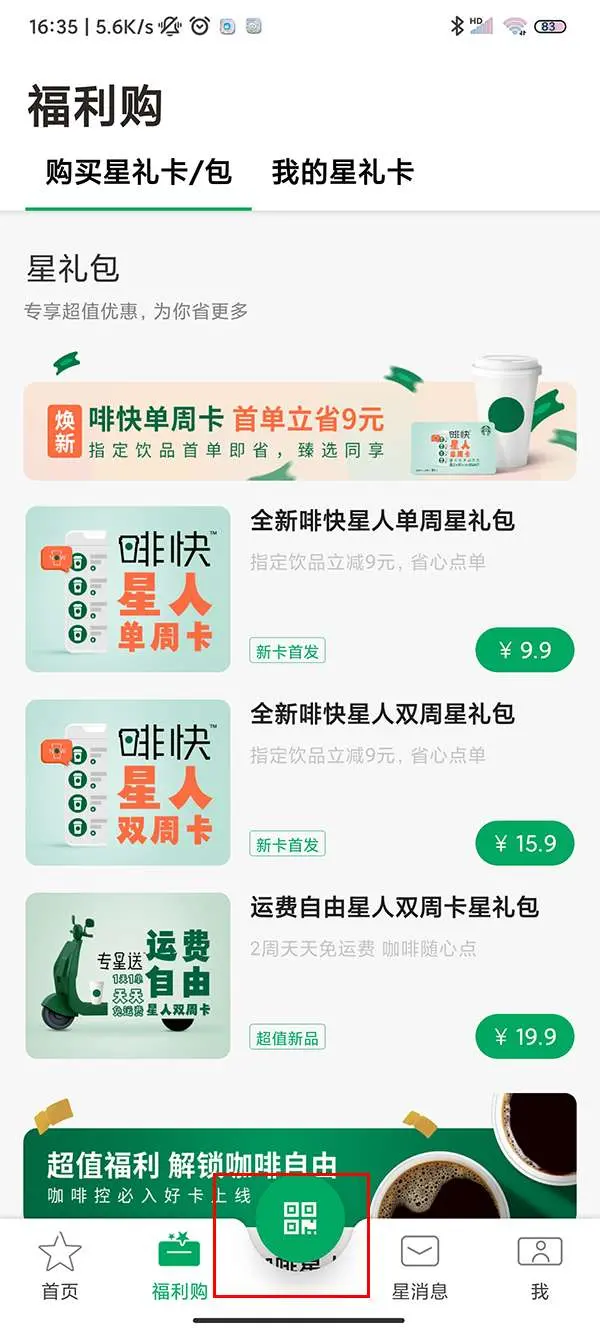 2.点击星巴克app的二维码图标,点击获取明星礼品卡,找到我的明星礼品卡。