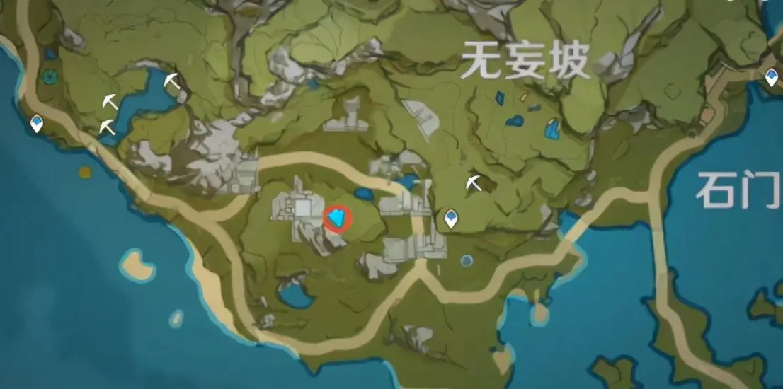 接完任务后,我们就可以看到三个碎片的坐标,图中下面三个六芒星就是碎片的位置了。接完任务后我们再开始寻找第一块碎片和机关,最好找的碎片在无妄坡左下方的遗迹旁边。