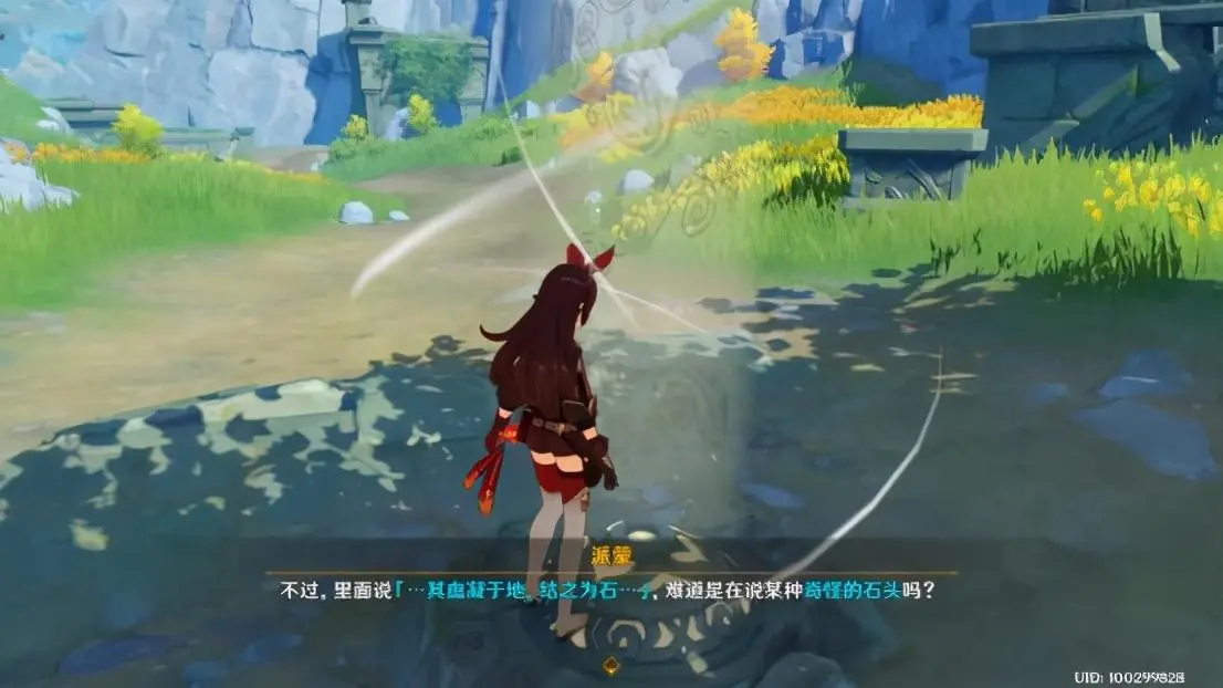 2、点击山顶的“奇怪的圆盘”,得到文字提示按照朝着风龙废墟,雪山,庆云顶和璃月港的四个方向解锁。