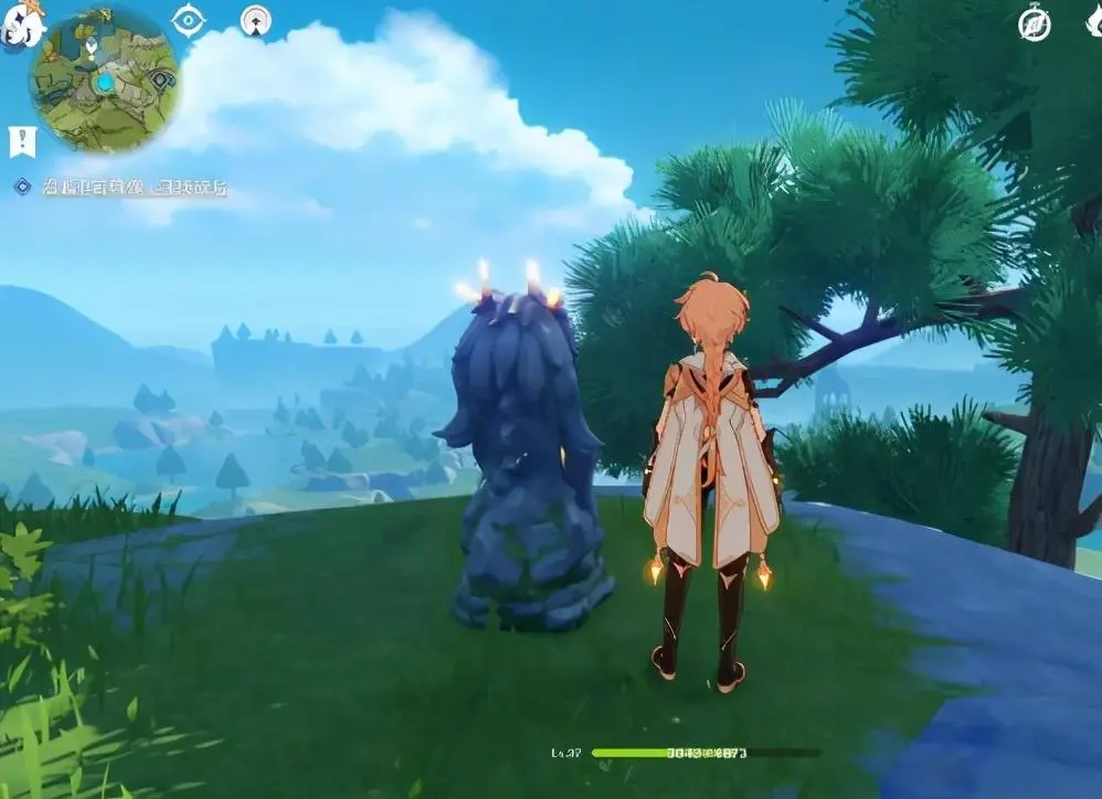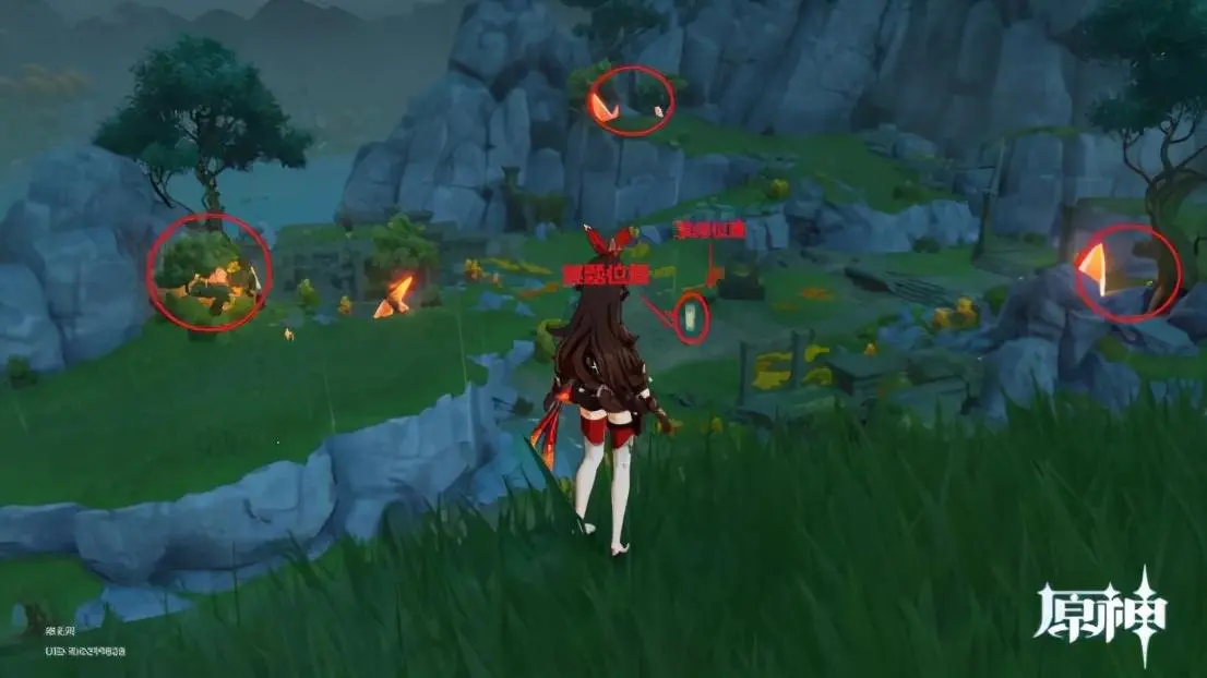 待咱们爬上山,还有一个岩神瞳碎片,拿完碎片之后别着急。山坡下面的平台上还有一个宝箱等着咱们开启,拿完奖励之后,就会发现山顶的第三个碎片石台。显然第三个石台开启方式和第二个碎片石台是一样的,都是同样的解谜方式。虽然这次的石台只有四个需要激活,但是这一次就显然要难得多,因为没有方向提示,只有很含糊的四个名词。经过了无数次的尝试,咱终于尝试出来了这四个石台的顺序,分别是: