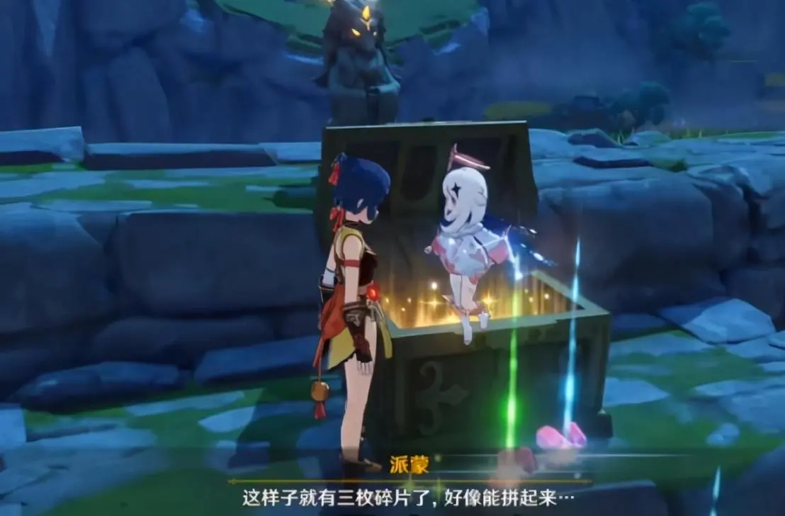 清完丘丘人后,我们可以看到碎片旁边会出现一个巨大的宝箱,里面就蕴含着常规奖励和第一个碎片。拿到第一个碎片以后,任务会提示我们去轻策村里寻找第二个碎片的下落和线索。