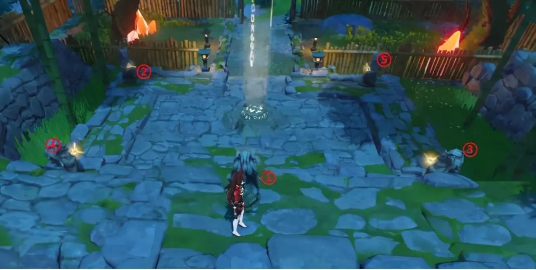 3、然后,按照图中箭头的顺序,点击启动四个石像。如图。