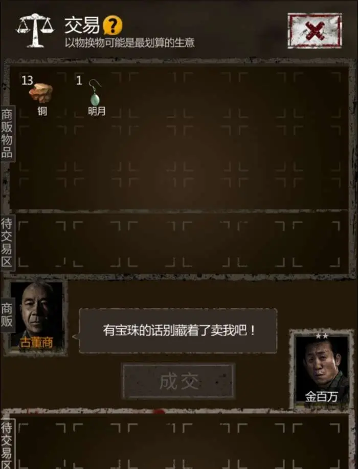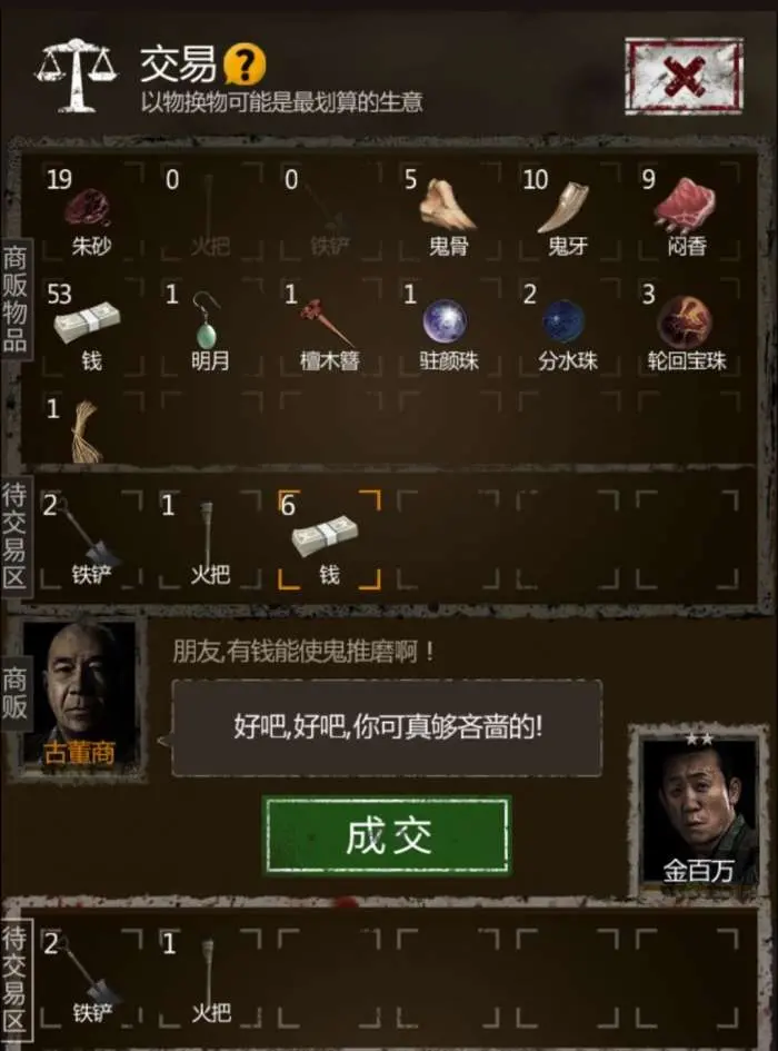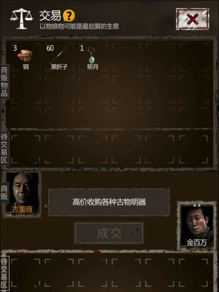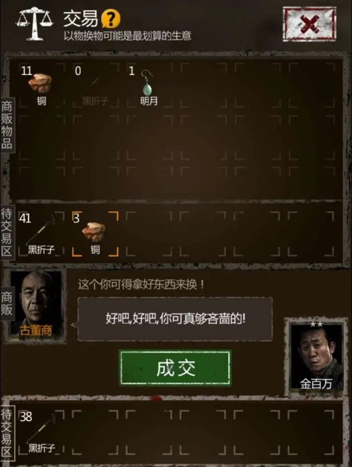 对猎户没用,我们不赚老人的钱。 再举个例子古董商的12黑折子可以换11黑折子,但给他10个,用劣质铜补,因为铁不够。