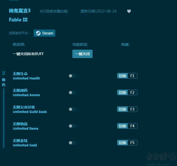 无限生命Unlimited Health无限弹药Unlimited Ammo无限公会印章Unlimited Guild Seals无限物品Unlimited Items无限金钱Unlimited Gold