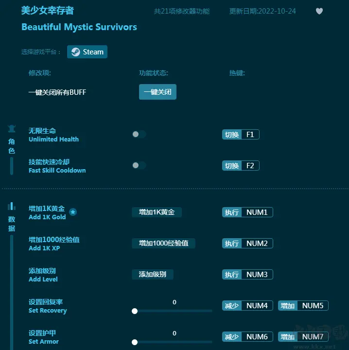 美少女幸存者修改器是为游戏《美少女幸存者》打造的万能强大的游戏辅助工具,内置21个游戏辅助功能,涵盖无限生命、无限技能、无限金钱、等级提升等数据,支持修改为玩家带来最爽快的全能游戏体验,赢得所有战争! 感兴趣的朋友请不要错过,KK下载网站推荐下载体验!