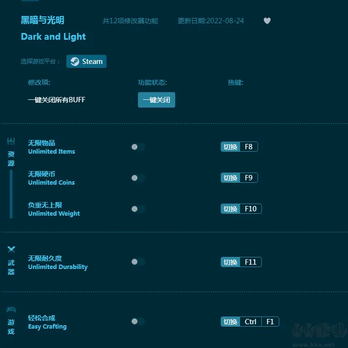 黑暗与光明12个修改器是为同名游戏《黑暗与光明》专门制作的游戏辅助工具,修改器非常强大,不仅为玩家的角色提供了强大的生命力和战斗力,而且为玩家提供了无限的资源。 黑暗与光明十二项修改器包含了无限的生命、无限的耐力、无宪法、无饥饿感、不渴、无限的东西等功能。 如果有需要的朋友的话就下载使用吧!