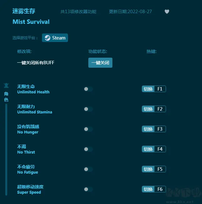 无限生命Unlimited Health无限耐力Unlimited Stamina无饥饿感No Hunger不渴No Thirst不累No Fatigue超级移动速度Super Speed无限物品Unlimited Items .