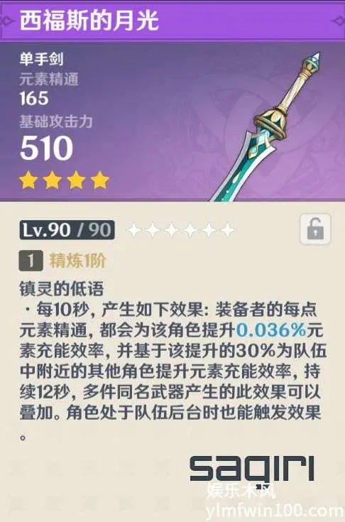 每10秒,装备者的每一点元素熟悉后,该角色的元素充值效率上升0.036%,在此上升30%的基础上,团队内附近其他角色的元素充值效率上升12秒,通过使用多枚同名武器,这里角色在队伍后台时也能发挥效果。