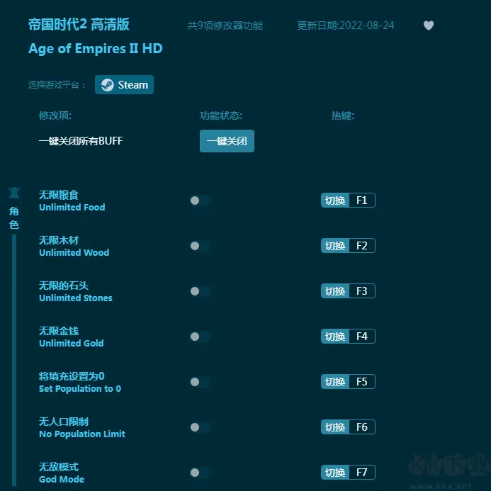 《帝国时代2高清版》是实时战略类游戏《帝国时代2》的高清翻拍版。 这个帝国时代2HD版9个修改器包含无限的粮食、无限的木材、无限的石头、无限的金钱、没有人口限制等功能,为玩家提供无限的资源发展自己的科技和军队,完成自己的帝国梦想。 有需要的朋友就来KK下载站下载使用吧!