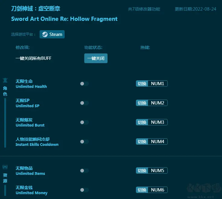无限生命无限健康无限sp无限爆发Unlimited Burst角色技能瞬间冷却Instant Skills Cooldown无限物品Unlimited Items无限金钱Unlimited Money一