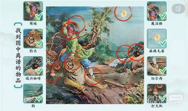 1、【武松打虎】关卡需要找出图中奇葩,如萌妹、豹子头、瑞兴咖啡、狗、魔法棒、麻辣毛蛋、切尔西、打火机等