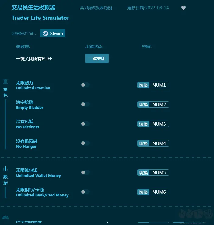 交易员生活模拟器修改器为玩家们提供7个强大的游戏辅助功能,专门为《交易员生活模拟器》游戏开发,没有无限的金钱、无限的耐力、肮脏、饥饿等。 有了这个交易员生活模拟器修改器,玩家一定能成为最好的交易员! 感兴趣的朋友请不要错过,KK下载网站推荐下载体验!