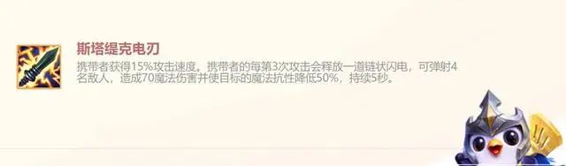 也就是说,厄加特达到两星之后,不算羁绊加成,技能可以攻击35次。如果算上变异战士和枪手的额外加成,那就非常夸张了。此外,有一件装备名为斯塔缇克电刃,携带者获得15%攻击速度。携带者的每第3次攻击会释放一道链状闪电,可弹射4名敌人,造成70魔法伤害并使目标的魔法抗性降低50%,持续5秒。给厄加特两件斯塔缇克电刃后,你能看到满屏闪电,先不说伤害有多高,视觉效果就让人感觉很快乐了。