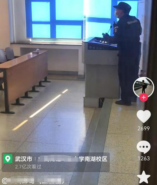 封面新闻记者找到视频发布账号,看到这条仅4秒钟的视频,视频中一位保安侧身站在讲桌边上,视频末尾拍到一名女生在座位坐着,被镜头一晃而过。视频产生了1200多条评论,评论中不少网友对此行为提出质疑,拍摄者回应称自己做保安工作月薪6000多,为人也不错,不理解为什么大家觉得保安不该在学校找对象。还解释称视频中“保安距离女生很远,也许只是在关心教室为什么只有她一人,暖心的问候为什么被你们说是在骚扰”。