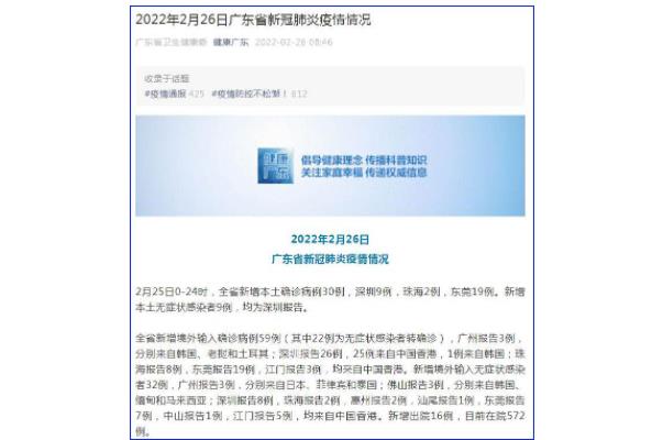2010年2月25日00时至24时,新增本地确诊病例30例,深圳9例,珠海2例,东莞19例。深圳新增9例无症状本地感染病例。新增境外输入性确诊病例59例(其中无症状感染病例22例),广州报告3例,分别来自韩国、老挝和土耳其。深圳报告了26例,25例来自中国香港,1例来自韩国。珠海报告8例,东莞报告19例,江门报告3例,均来自中国香港。新增32例无症状感染病例为境外输入,广州报告3例,分别来自日本、菲律宾和泰国。佛山报告3例,分别来自韩国、缅甸和马来西亚。深圳报告8例,珠海2例,惠州2例,汕尾1例,东莞7例,中山1例,江门5例,均来自中国香港。16个新病例已出院,572个病例目前在医院。截至2月25日24时,全省共报告新冠肺炎阳性感染病例8132例(境外输入病例5950例),其中确诊病例4434例(境外输入病例2658例),无症状感染病例3698例(境外输入病例3292例)。