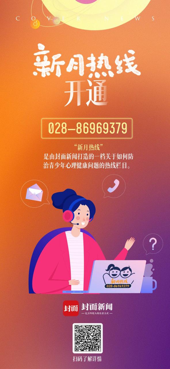 新闻封面每周二“封面天天见校长”栏目、每周三“封面天天见健康”栏目都会有一期“新月热线”。“新月热线”将带领家长朋友走进医院、学校,咨询专家、校长、老师,了解现代青少年的心理健康状况,分享权威的心理健康科普知识,寻找青少年心理疾病的科学预防方法。如果家长朋友想咨询青少年心理健康方面的问题,也可以拨打热线电话:028-86969379,我们会找专家为您解答。