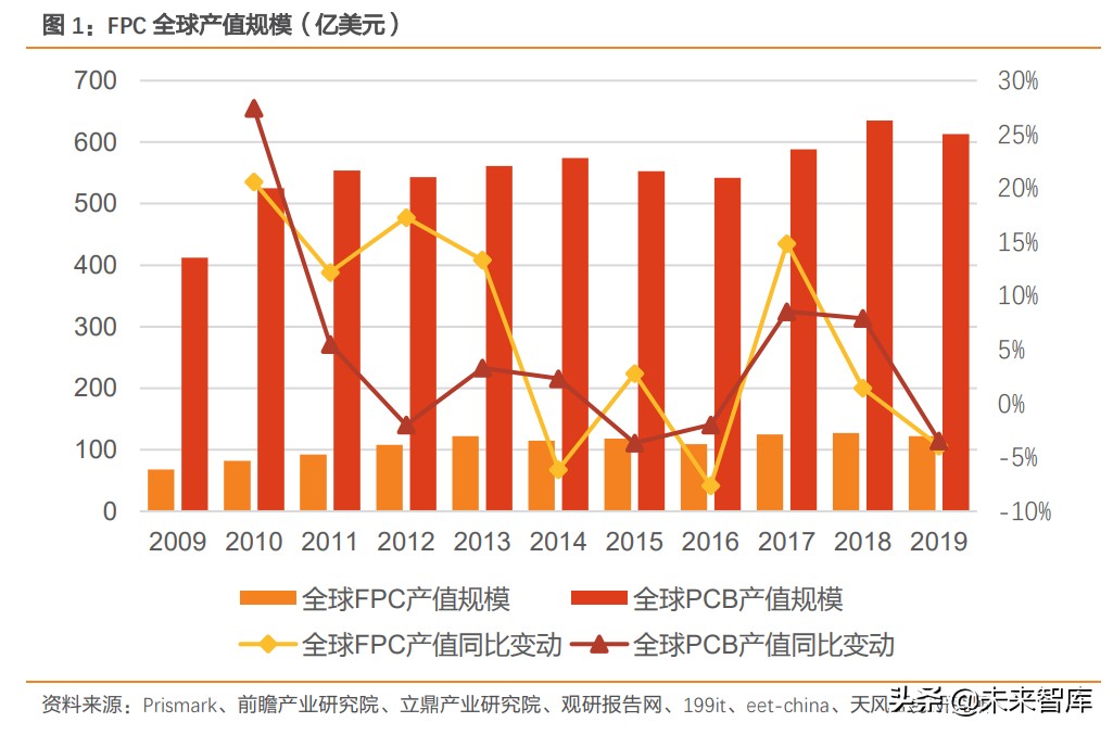 FPC业绩优异,19年成长引领行业成长。FPC是一种由聚酰亚胺或聚酯薄膜制成的高度可靠且极其灵活的印刷电路板。FPC具有布线密度高、体积小、轻薄、安装连接一致、折叠弯曲、立体布线等优点。是其他类型PCB无法比拟的,符合下游电子行业智能化、便携化、轻量化的趋势。2009年至2019年,FPC产值复合增长率为6%,高于PCB行业4.1%的增长率。1999年,FPC的全球产值为122亿美元,占PCB产值的20%。