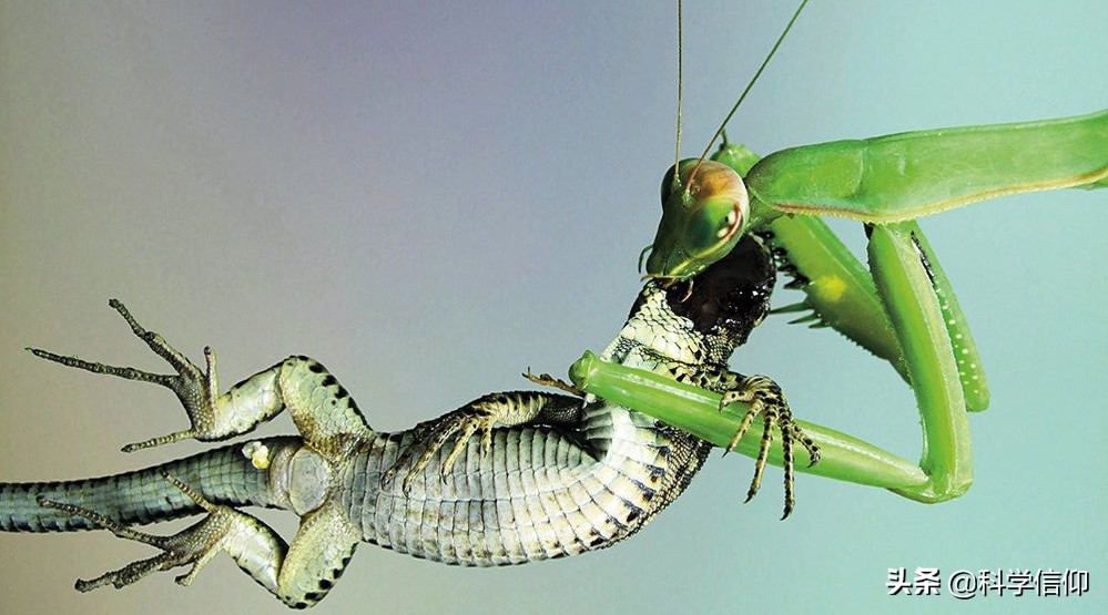说起“性食人”,有两种昆虫最为典型。一个是螳螂,一个是蜘蛛。先说螳螂吧。如果母螳螂想吃公螳螂,那简直是小菜一碟,因为母螳螂的外形比公螳螂大得多。然而,与蜘蛛的“性同类相食”不同,雌螳螂并不吃掉雄螳螂,为繁殖下一代补充营养。螳螂是自然界中最好的猎手。同等重量下,没有任何动物是螳螂的对手。比如在同等重量的螳螂面前,狮子和老虎很难存活半分钟以上。