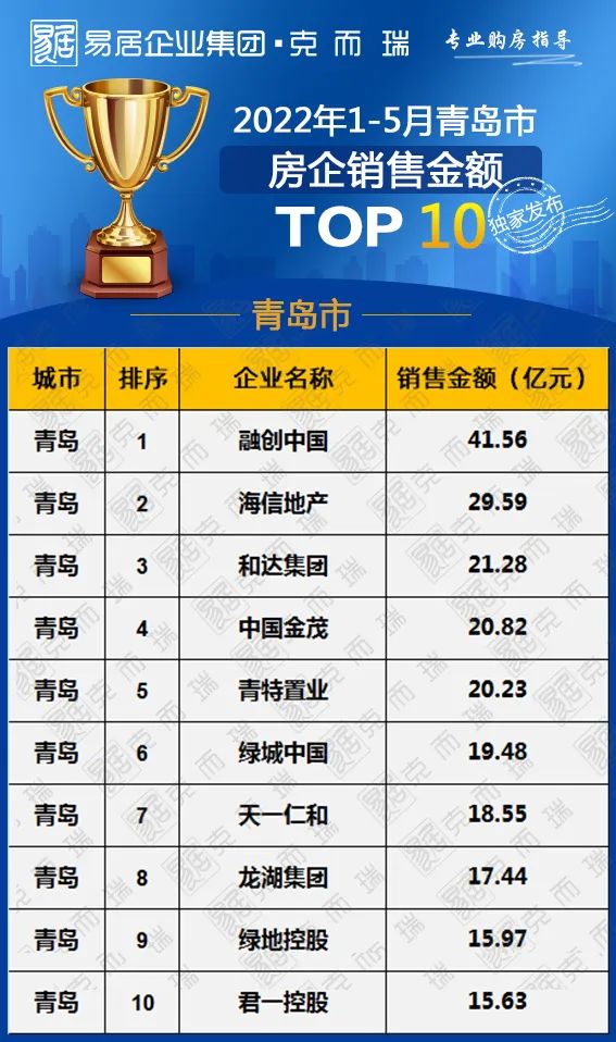 5月31日,嘉里青岛机构隆重发布:2022年1-5月青岛房企销售金额排行榜TOP10、2022年1-5月青岛房企销售面积排行榜TOP10。
