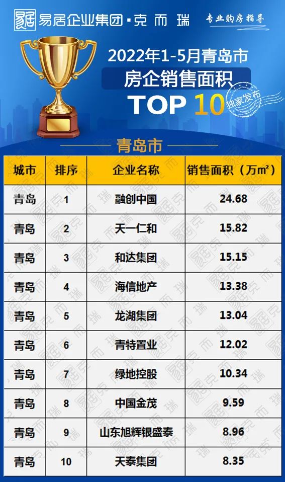 2022年1-5月,青岛房地产企业销售面积排名前10。