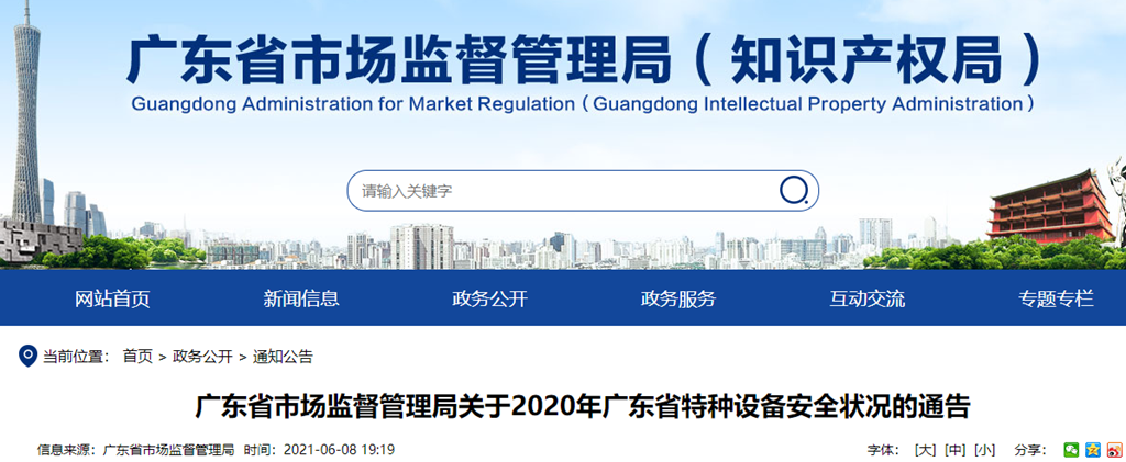 中国质量新闻网广东省市场监督管理局网站6月8日发布2020年广东省特种设备安全状况公告。