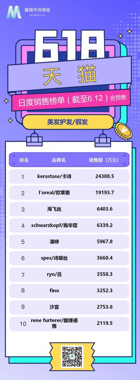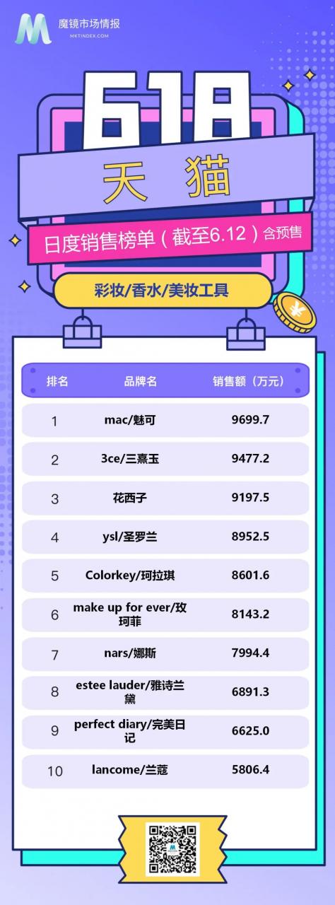 今天魔镜市场情报盘点美容护理行业截至6月12日天猫平台累计销售额的品牌排名(含预售)。