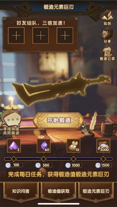 2.锻造元素巨刃,冒险事件与完成游戏指定任务获得锻造值。