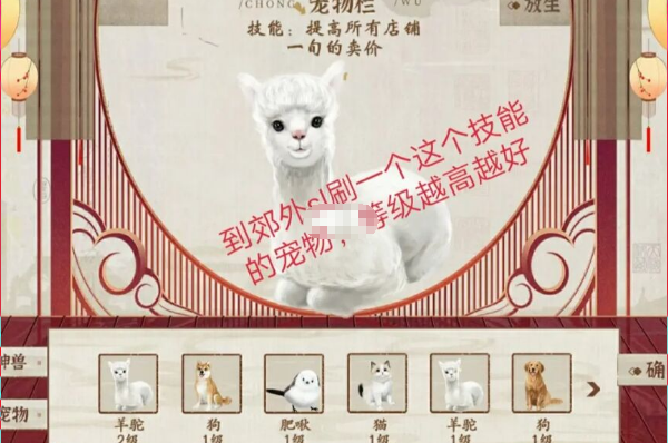 2、到郊外挂机那里,sl一个提高所有店铺一旬的卖价的宠物,等级越高越好,当天晚上点宠物使用。