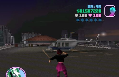 侠盗飞车有三处地方有直升机, 可以直接过去开,第一处是第二座桥过去左边的房子上, 需要完成任务才能去这个地方, 如下图镜头显示的房子楼顶就有一台直升机。