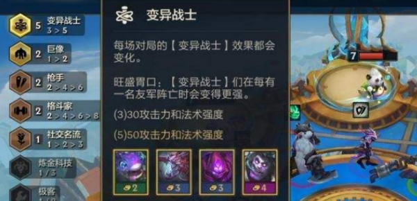 而在变异战士阵容中,包含有多个阵容羁绊,而这些阵容羁绊分别为5变异战士羁绊、2巨像羁绊、1社交名流羁绊、2格斗家羁绊以及2圣盾使羁绊。