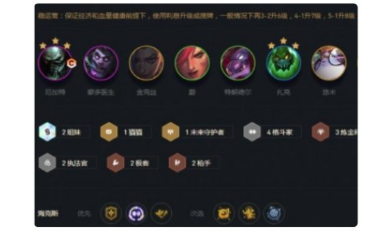 2-1升级4人口,2-5升级5人口,尽量走连胜,如果没有电刀可考虑卖血3波,找电刀。打工阵容有狼人直接3炼金+挑战+2格斗最优。前排坦度装备建议给予卡蜜尔强度会非常高。