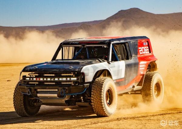先从台阶上一跃而下的那个“方盒子”就是福特的Bronco R赛车,该车基于新款福特Bronco打造。2019年正值福特第一代Bronco车型1969年赢得BAJA胜利的50周年,为了参加BAJA 1000比赛,福特基于当时还没有正式发布的新一代Bronco打造了这款Bronco赛车,并在2020年再次获得了BAJA 1000比赛的胜利。