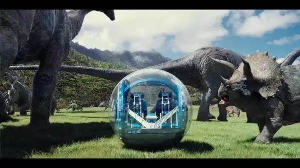 《侏罗纪世界》里,雷龙依旧将在草原上活动,供游客坐在玻璃球观光车内参观。