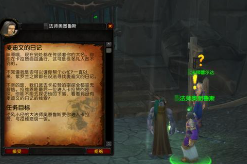 1、夜之魇任务的起始点位于卡拉赞门口,玩家找奥图鲁斯可以接到一个名为《麦迪文的日记》的任务。不过这个任务需要玩家在“紫罗兰之眼”的声望达到尊敬才能开启。