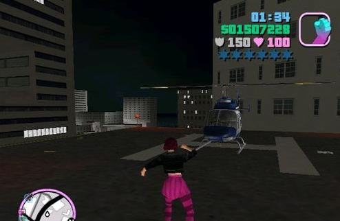 侠盗飞车有三处地方有直升机, 可以直接过去开,第一处是第二座桥过去左边的房子上, 需要完成任务才能去这个地方, 如下图镜头显示的房子楼顶就有一台直升机。