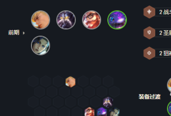 中期过渡体系,我们仅需在前期过渡体系基础上,补加机器人以及大嘴即可,补加机器人凑出3圣盾使羁绊,进一步提升圣盾使羁绊给予的护盾加持,而补加大嘴则凑出2枪手羁绊,提升体系整体的输出表现。此外,就是6人口我们可补出3变异战士羁绊,或者根据情况选择凑2保镖都是可行的,根据实际对局战况而定。