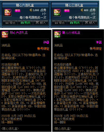 随心选礼盒总共有两种,分别是售价1666点券的随心六选礼盒,以及售价466点券的随心三选礼盒。顾名思义随心六选礼盒可以在17种道具选择6件道具,随心三选礼盒可以在17种道具可以选择3件道具,值得注意的是每样随心选礼盒都是账号限购一次,且只能有点券购买,不能用代币券购买。