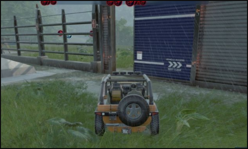 4、将车开到恐龙养殖圈门口停下就会自动打开大门。