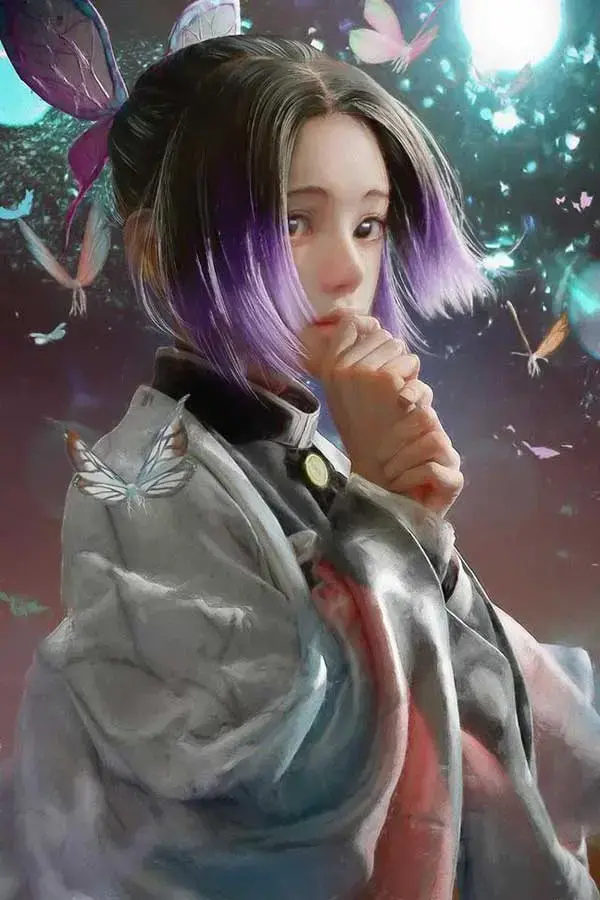 蝶泳的整体形象美丽优雅,她有一头黑色的头发,头发稍前有温柔的紫色。 蝴蝶忍的头上戴着梦幻般的蝴蝶发饰。 她在动画片里总是露出笑容。 这个笑容看起来很神秘。 蝴蝶总是表情平静,但她的心里也藏着很多心事。